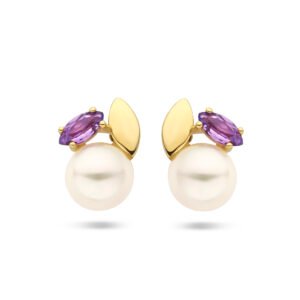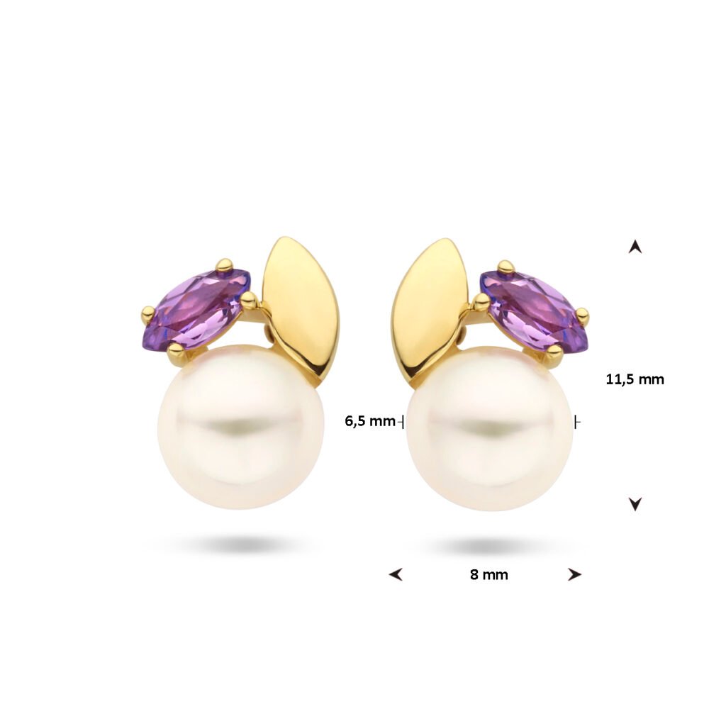 14k Geelgouden oorknoppen uitgevoerd met een zoetwaterparel en amethist. De oorknoppen hebben een afmeting van 11.5x8mm.