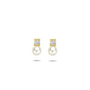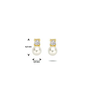 14k Geelgouden oorknoppen uitgevoerd met een schitterende zoetwaterparel en zirkonia. De oorknoppen hebben een afmeting van 6×3.5mm.