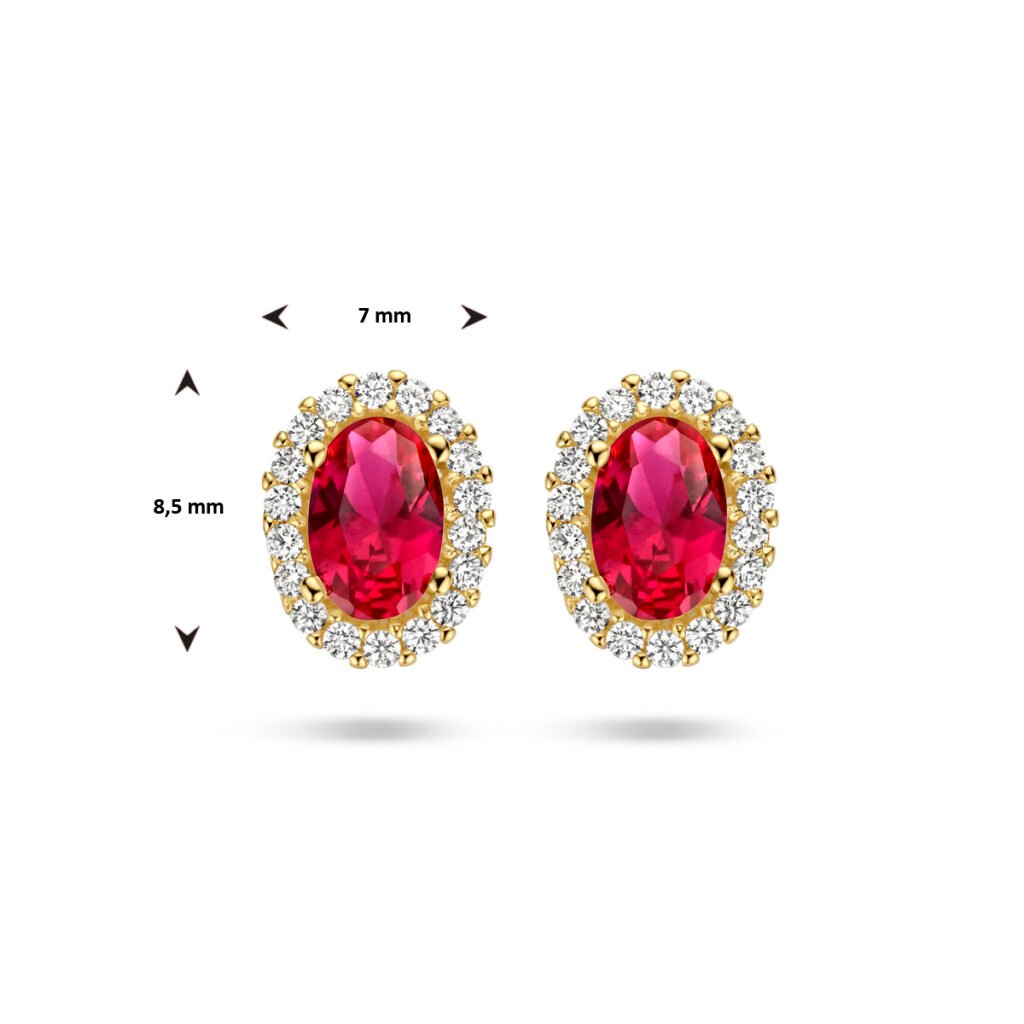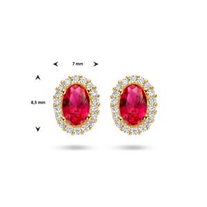 14k Geelgouden oorknoppen uitgevoerd met schitterende rode zirkonia. De oorknoppen hebben een afmeting van maat 8.5x7mm.