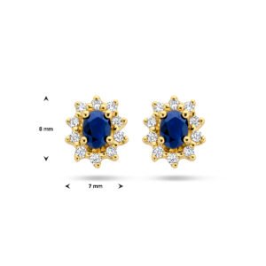 Geelgouden oorknoppen met saffier en diamanten. De oorknoppen zijn onderdeel van een set.