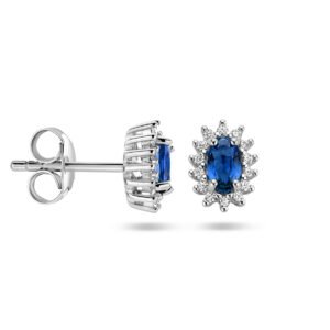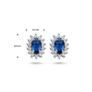 Deze stijlvolle Dames Oorknoppen Zilver met synthetische Saffier en Halo met Zirkonia’s zijn vervaardigd uit 925 Sterling zilver, dat is voorzien van een gerhodineerde coating en is gepolijst. De oorknoppen hebben een metaalgewicht van circa 1,19 gram. Deze oorknoppen zijn uitgevoerd met een chaton gezette, ovaal geslepen, groene synthetische Saffier met hoogte van 5 mm en een breedte van 3 mm, met daaromheen een halo van transparante Zirkonia stenen, waardoor de totale afmeting van de knop 8,5 bij 6,5 mm bedraagt. De oorknoppen worden gesloten met een vlindersluiting.