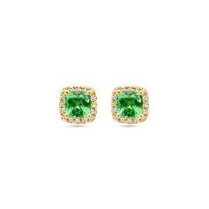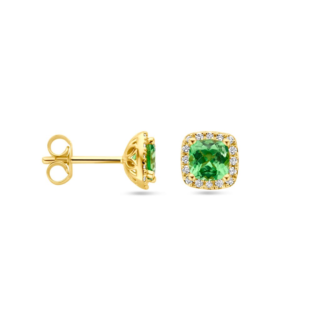 14k Geelgouden oorknoppen uitgevoerd met tsavoriet en diamant. De oorknoppen hebben een afmeting van 7x7mm. De totale diamantgewicht is 0.18ct.
