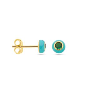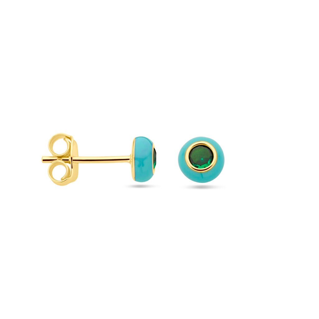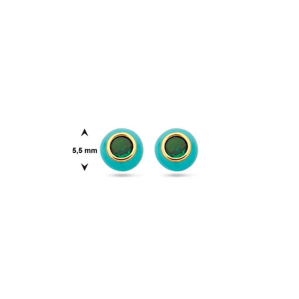 Geelgoud op 925 zilveren oorknoppen uitgevoerd met turquoise emaille en groen zirkonia. De oorknoppen hebben een diameter van 5,5mm. Geen garantie op plating.