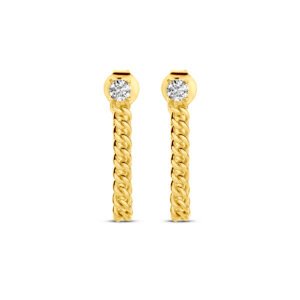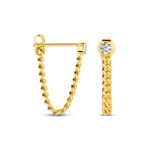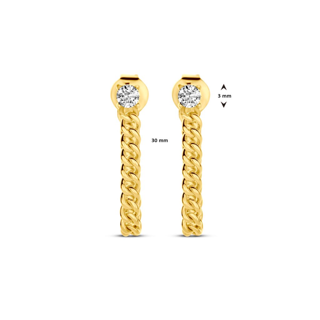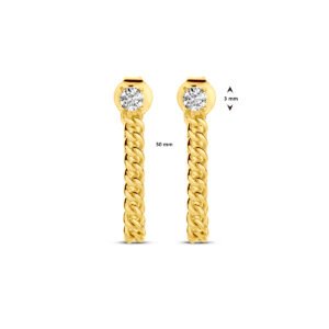 Geelgoud op 925 zilveren oorknoppen uitgevoerd met zirkonia. De steen heeft een diameter van 3mm. De schakel heeft een lengte van 3cm. Geen garantie op plating.