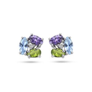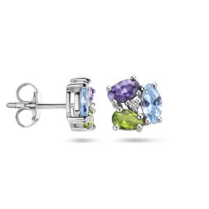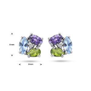 Gerhodineerd 925 zilveren oorknoppen uitgevoerd met vier stenen: zirkonia, zirkonia amethist, synthetisch blauw spinel en synthetisch peridot. De oorknoppen hebben een afmeting van 8x8mm.