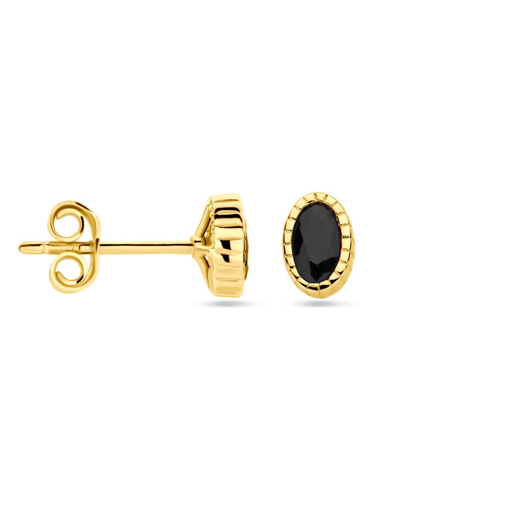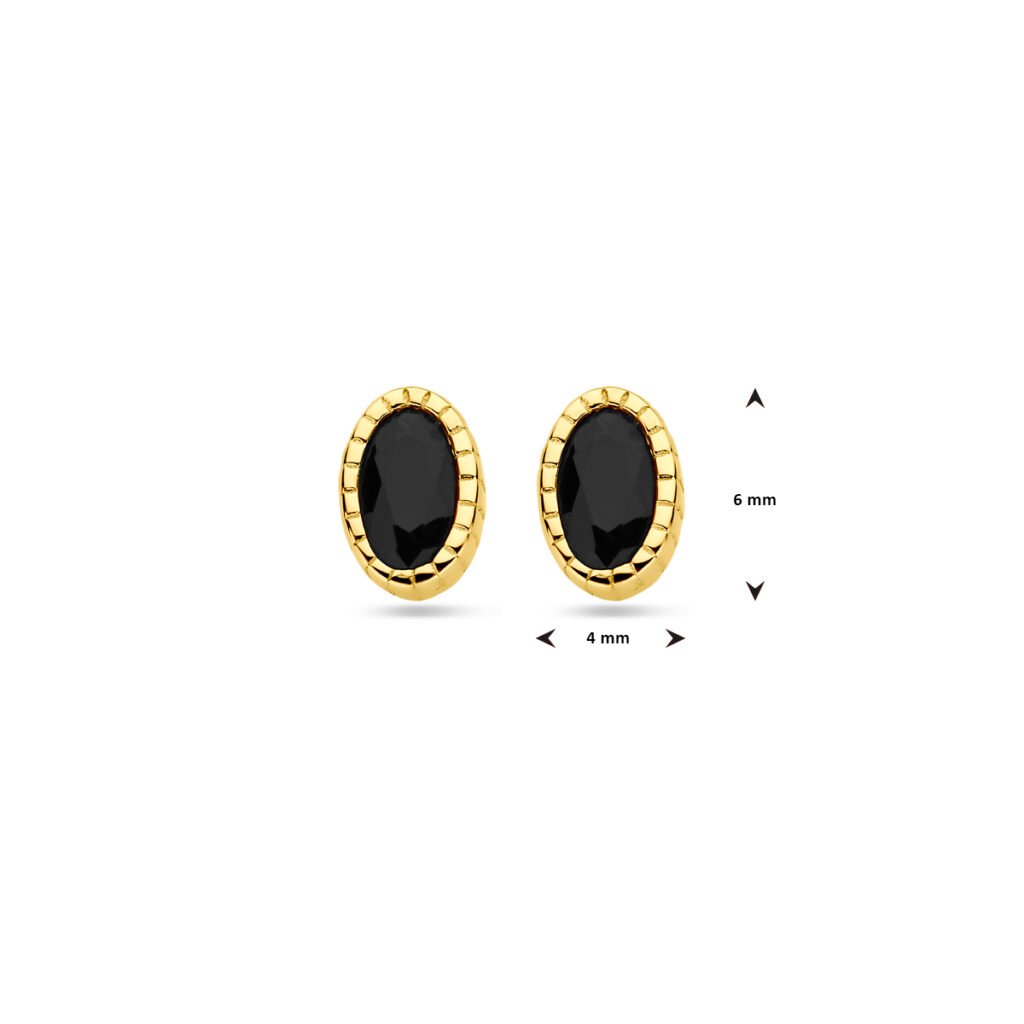14k Geelgouden oorknoppen uitgevoerd met zwart zirkonia. De oorknoppen hebben een afmeting van 6x4mm.