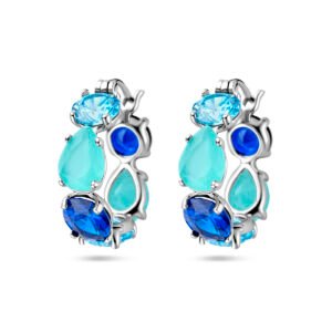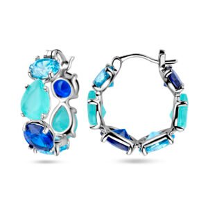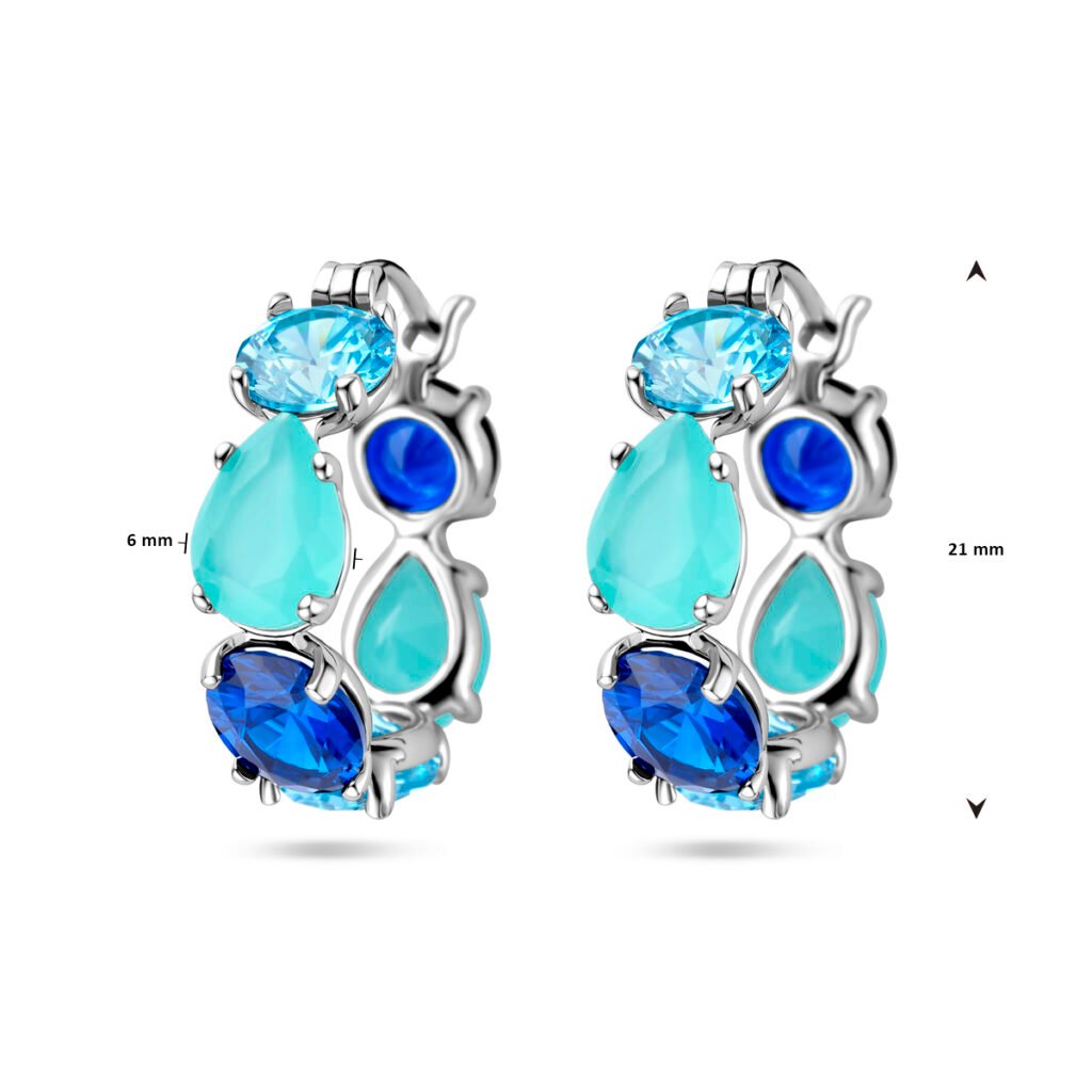 Gerhodineerd 925 zilveren oorringen uitgevoerd met gekleurd zirkonia en glas stenen. De oorringen hebben een afmeting van 21x6mm.