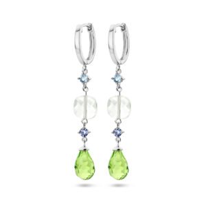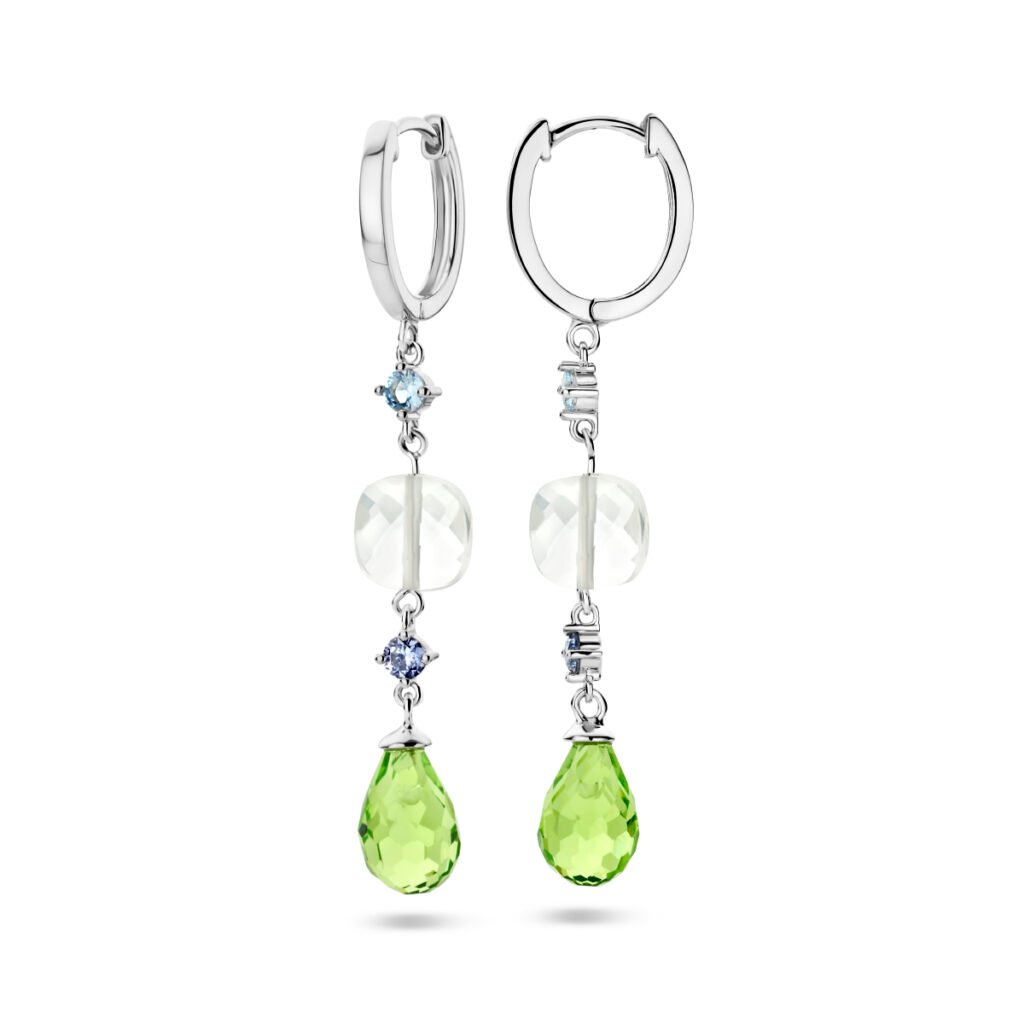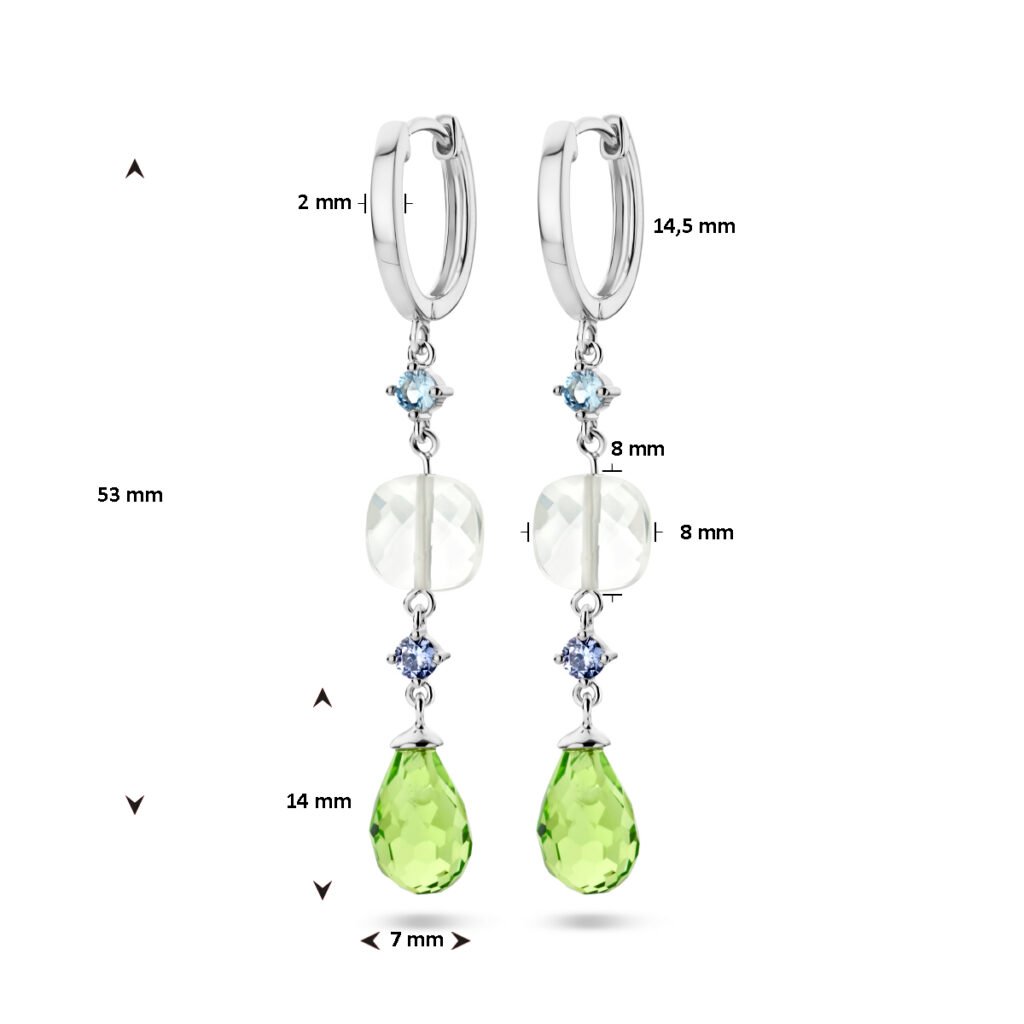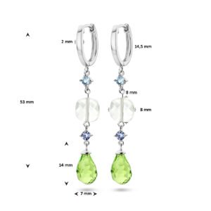 Deze Zilveren Klapoorringen met Kleurstenen en Zirkonia’s zijn vervaardigd uit 925 Sterling zilver, dat is voorzien van een coating van Rhodium. De klapcreolen hebben een breedte van 2 mm bij een diameter van 14,5 mm. De klapoorringen hebben een metaalgewicht van circa 4,5 gram. De totale hoogte van deze oorringen bedraagt 53 mm en is opgebouwd uit de creool, 2 maal een licht blauwe synthetische Spinel steen, met daartussen een ronde kraal van witte Zirkonia steen met een diameter van 8 mm en onderaan een druppelvormige hanger van Tanzaniet Zirkonia steen met een lengte van 14 mm en een breedte van 7 mm.