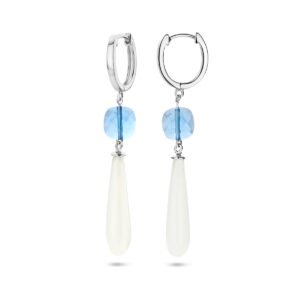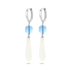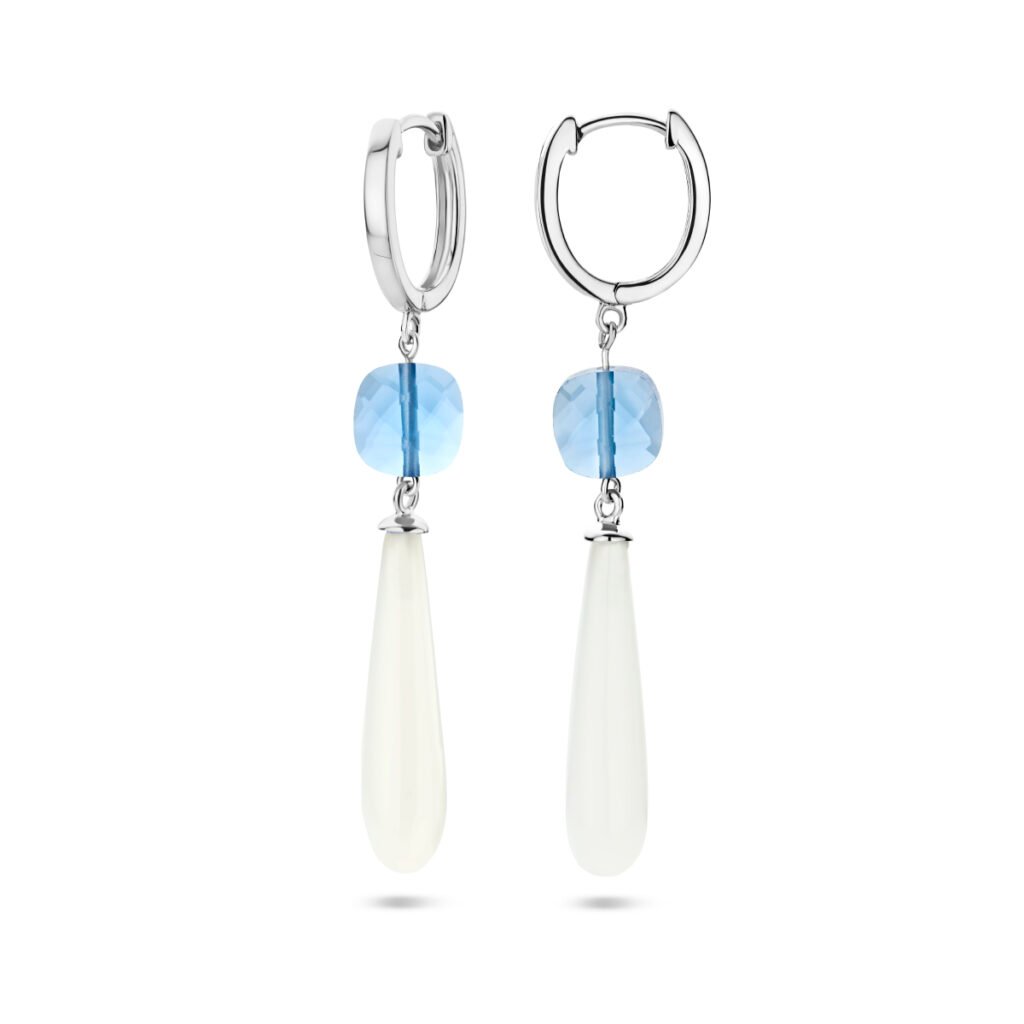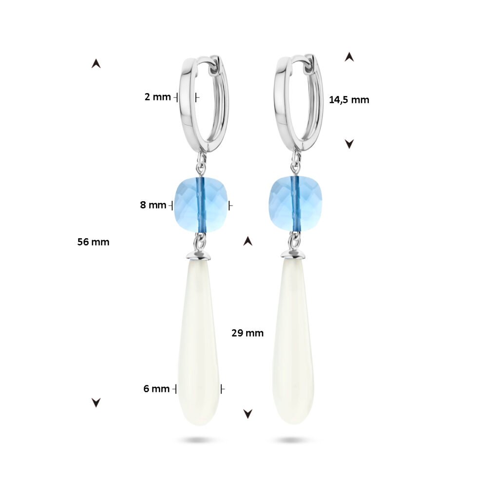 Gerhodineerd 925 zilveren klapoorringen met blauw en wit kleurstenen. De oorhangers hebben een totale hoogte van 56mm.