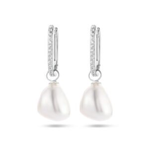 Gerhodineerd 925 zilveren oorringen uitgevoerd met zoetwaterparels en zirkonia. De oorringen hebben een totale hoogte van 28mm.