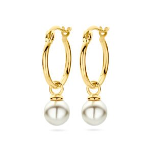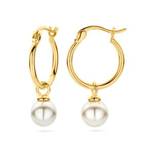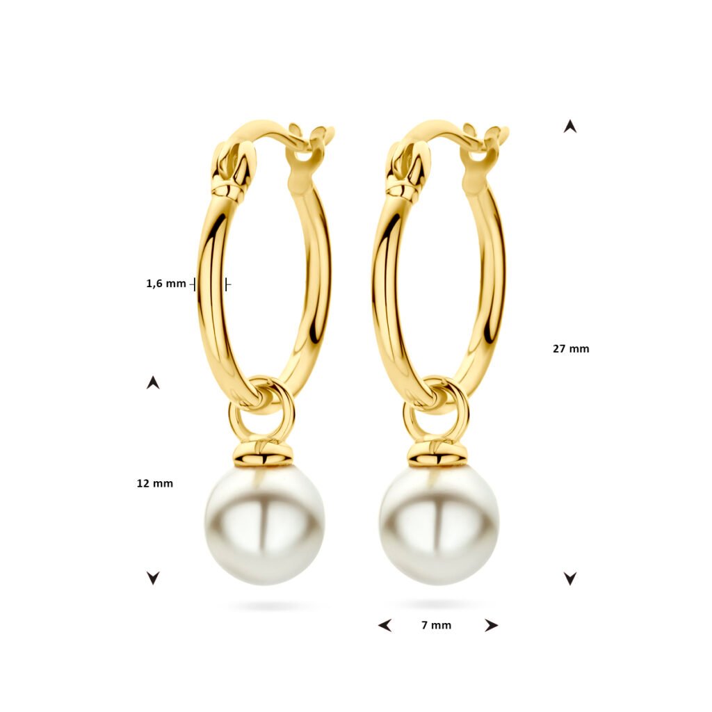 Geelgoud op 925 zilveren oorringen uitgevoerd met synthetische parel. De oorringen hebben een totale hoogte van 27mm. Geen garantie op de plating.