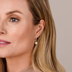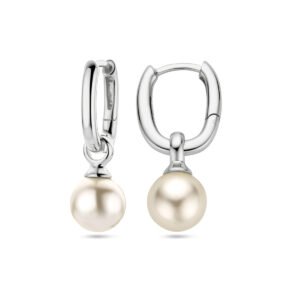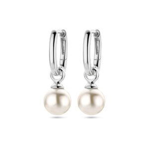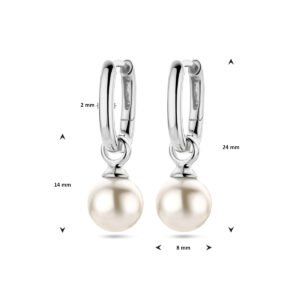Gerhodineerd 925 zilveren oorringen uitgevoerd met witte imitatieparel. De oorringen hebben een totale hoogte van 24mm.
