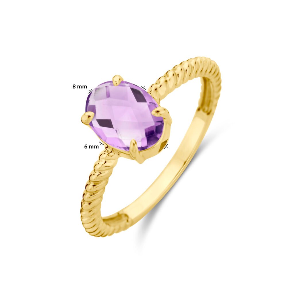 14k Geelgouden ring uitgevoerd met amethist. De steen heeft een afmeting van 8x6mm.