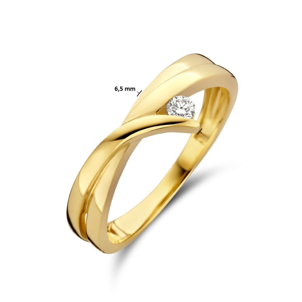 14k Geelgouden ring uitgevoerd met een schitterende diamant. De ring heeft een breedte van 6.5mm.
