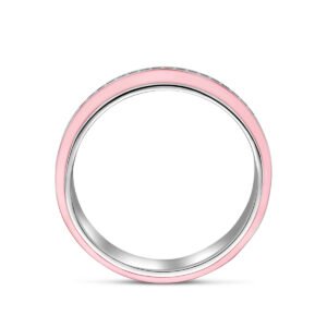 Gerhodineerd 925 zilveren ring uitgevoerd met roze emaille en zirkonia. De ring heeft een breedte van 6.5mm.