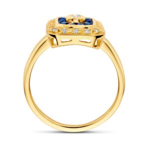 14k Geelgouden vintage ring uitgevoerd met saffier en diamant. De ring heeft een breedte van 14.5mm. Het diamantgewicht is 0.25ct.