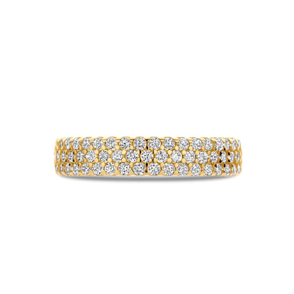 14k Geelgouden ring uitgevoerd met zirkonia. De ring heeft een breedte van 4mm.