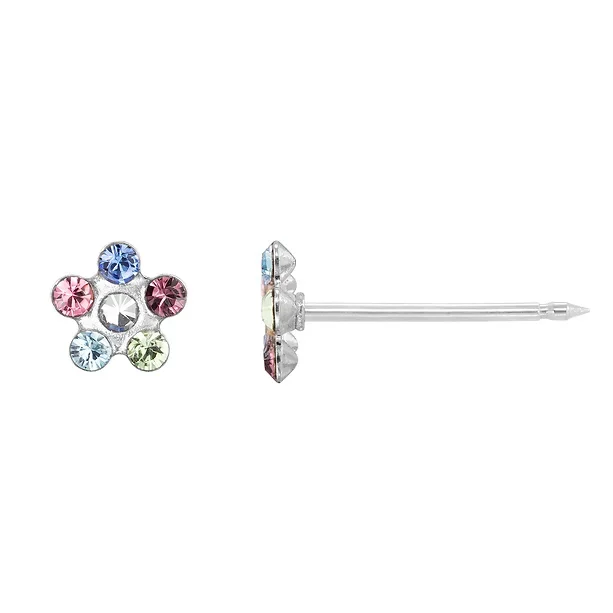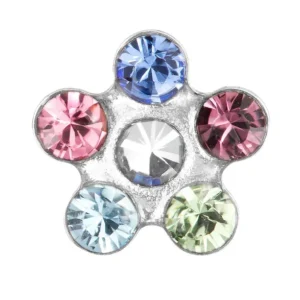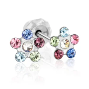 Deze prachtige Zilverkleurige Schietoorbellen met Bloem Regenboog van Inverness, ook wel zweerknopjes genoemd, zijn vervaardigd uit 316 L Stainless Steel (chirurgisch staal) in de vorm van een bloem, waarbij in ieder bloemblad een geslepen ronde gekleurde Zirkonia steen is verwerkt. De doorsnee van deze Zilverkleurige Schietoorbellen met Bloem Regenboog van Inverness is 5 mm.