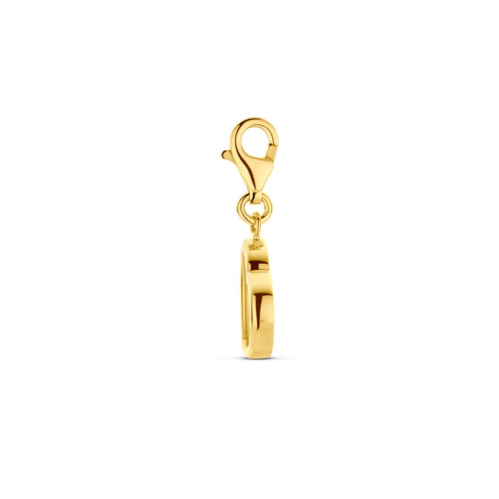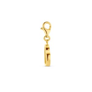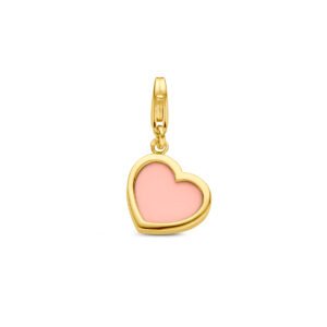 14k Geelgouden slotbedel uitgevoerd met synthetisch roze koraal. Het hart heeft een afmeting van 10x10mm.