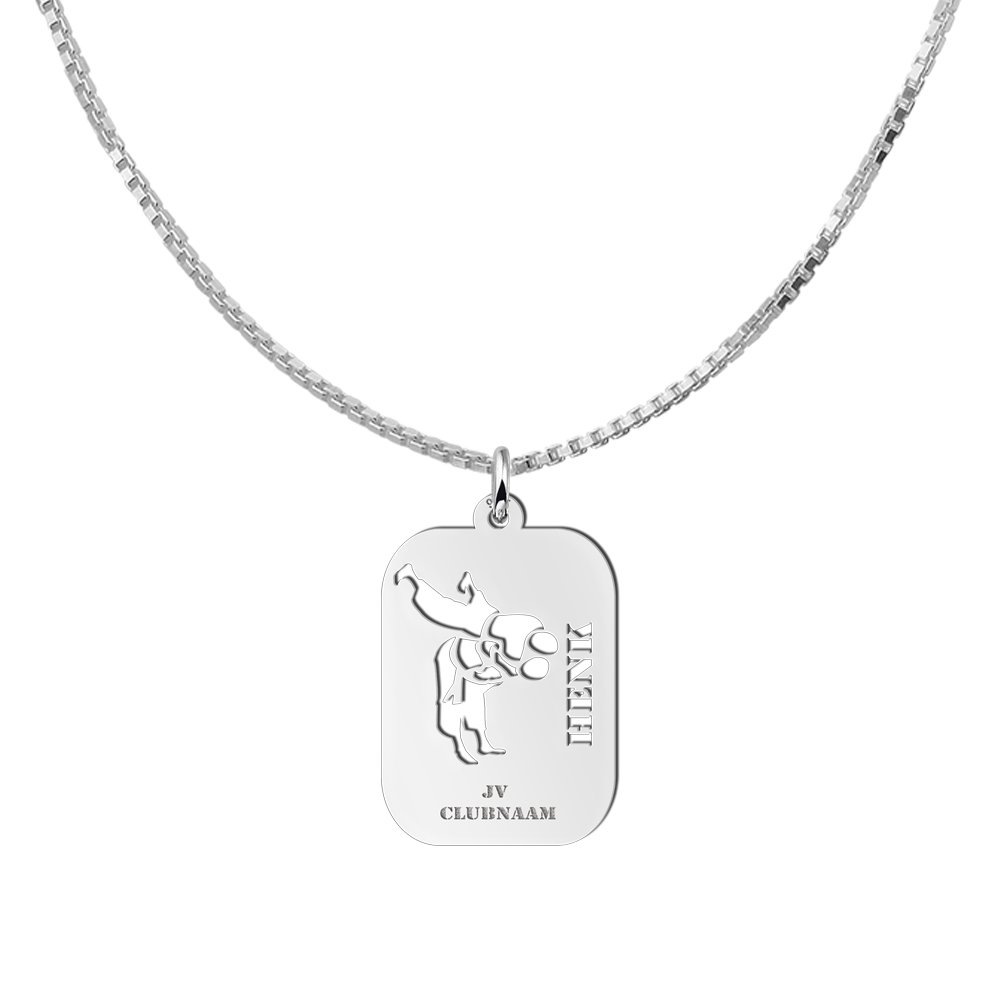 Deze judo sporthanger heeft een formaat van 16×23 mm en is gemaakt van 925 sterling zilver. De zilveren kettinghanger voor heren bestaat uit een glad zilveren plaatje met twee uitgespaarde judoka’s. Rechts op het plaatje is er ruimte voor één door u opgegeven uitgespaarde naam en onderaan is er plaats voor één door u opgegeven uitgespaarde datum.